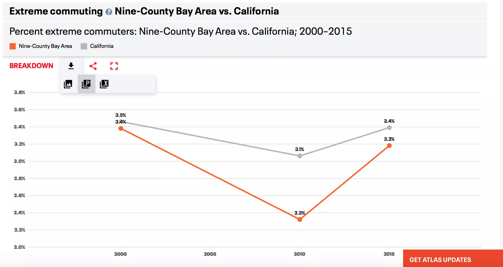 We want to make it as easy as possible for you to use Equity Atlas data in your work, so we added a new feature that allows you to download a PowerPoint deck about your selected indicator and the chart or map image. On any Indicator page, go to the "Download" symbol on the "Breakdown/Filter" menu and choose the "PowerPoint download." Pro-tip: Download PowerPoint presentations for multiple breakdowns of one indicator, or for multiple indicators, and combine the images into a single presentation.