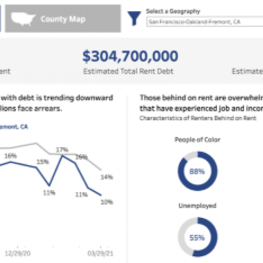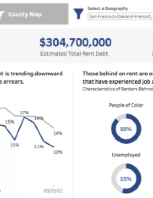 This month we released a new data dashboard, produced in partnership with the Right to the City Alliance, to equip equity advocates and policymakers with regularly updated local data on the extent of rent debt and the characteristics of renters affected by it. In the five-county Bay Area, 58,000 households owe an average of $5,300 each in rent. About 88 percent of those behind on rent are people of color, and nine in 10 lost employment income during the pandemic. See our accompanying analysis for more insights into the data and the policy solutions that can protect impacted renters.