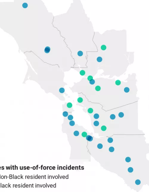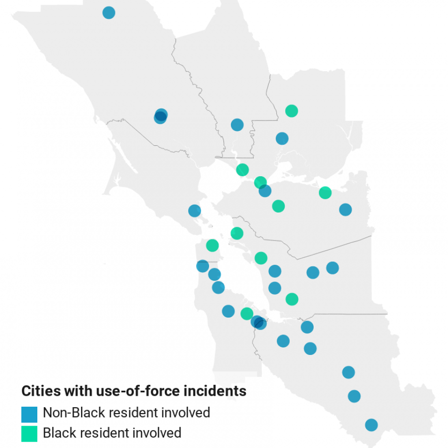 To inform the discussion about police violence in our region, we took a deeper look at the use-of-force indicator in the Atlas, specifically examining incidents involving Black residents. In 2016 and 2017 combined, law enforcement agencies in 51 of the 101 Bay Area cities and towns reported use-of-force incidents, and Black people were disproportionately the victims: Of the nearly 200 incidents, one fifth involved Black people even though they make up just 6 percent of the region’s population. And while the absolute number of incidents were highest in the larger cities, the highest rates of use of force were in Pleasant Hill, Redwood City, and Dublin, all affluent, suburban communities with relatively small Black populations (each 5 percent or less). In Pleasant Hill, the rate of use-of-force incidents per 100,000 people is 169 for Black people compared to just 4 for White people.