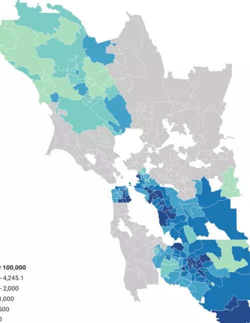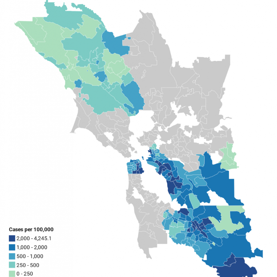 To track the community-level impact of the pandemic, the Atlas team launched a new automatically-updated dashboard that provides ZIP code-level data on total Covid cases from the four Bay Area counties that publish such detailed geographic data: Alameda, San Francisco, Santa Clara, and Sonoma. By analyzing Covid cases in each ZIP code in relation to the share of Black and Latinx residents, the dashboard highlights how neighborhoods with large populations of color have been hardest hit: The four ZIP codes with the highest case rates are majority-Latinx or majority-Black. Targeted strategies are needed to improve conditions in these hotspots, including community testing, better enforcement of workplace safety standards, rental supports, and continued eviction protections.