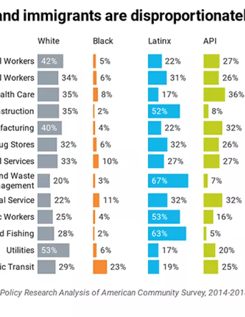 Essential workers — grocery clerks, farmworkers, bus drivers, construction workers, janitors, health-care workers, delivery drivers, and more — are on the frontlines of this pandemic, yet recent studies underscore how they are especially at risk of contracting COVID-19 and particularly vulnerable to its economic impacts. Our new profile of the Bay Area’s 1.1 million-strong essential workforce, based on regional data provided by the Center for Economic and Policy Research (CEPR), including disaggregation within the region’s large and diverse Asian population, finds that Latinx, Black, Filipinx, women of color, and immigrants are disproportionately represented in essential industries. These workers also have economic and social vulnerabilities: They are more likely to live in or near poverty, pay unaffordable rents, lack US citizenship, lack health insurance, and be caring for children and/or seniors at home.