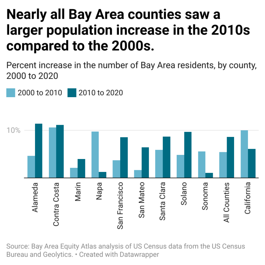 • The Bay Area’s population grew faster in the 2010s than in the 2000s, with three of the four North Bay counties growing at the slowest rate over the decade.