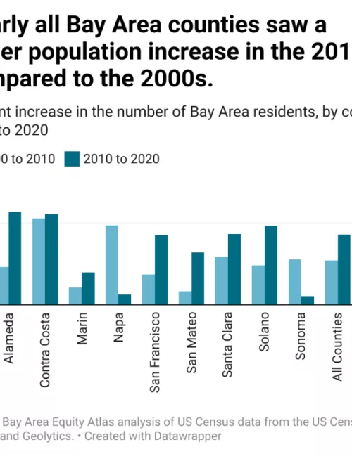 Since 2010, the Bay Area’s population has grown in size, become more diverse, and grown older. Policymakers, local governments, and community leaders alike must be prepared to meet the shifting needs of local residents, particularly in the many different communities of color driving population growth across the Bay Area. At the same time, decision-makers must also address the region-wide challenges in equitable housing and infrastructure that have existed long before 2010. To ensure a more equitable and inclusive Bay Area in the 2020s and beyond, we must: