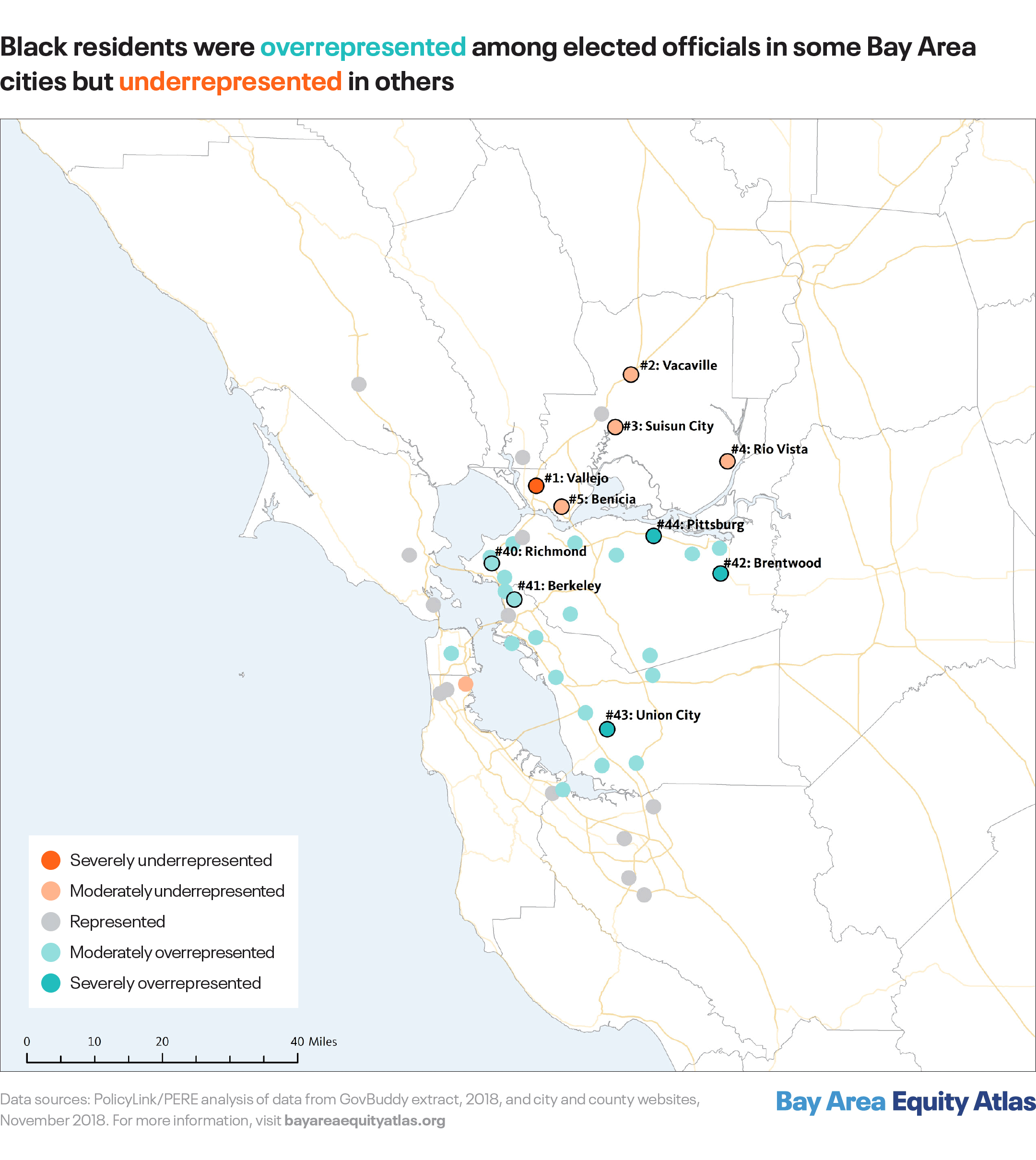 The Latinx population was underrepresented among top elected officials in most Bay Area cities and towns. As of May 2018, the Latinx population was severely underrepresented in 26 municipalities and moderately underrepresented in 49. The most severe underrepresentation was in the majority-Latinx cities of East Palo Alto and San Pablo, due in part to the fact that there were no Latinx electeds among the county supervisors or district attorneys in Contra Costa or San Mateo counties (there are also no Latinx supervisors or district attorneys in Alameda, Marin, or Sonoma counties). In four Bay Area cities (Antioch, Healdsburg, Oakley, and South San Francisco), Latinx people make up at least a third of the population, but there were no Latinx elected officials.